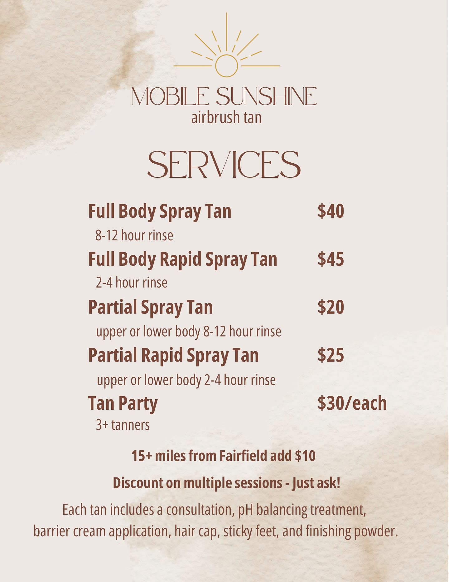 Mobile Sunshine Airbrush Tan is a locally owned, professional airbrush tanning service offering custom, natural-looking spray tans designed to boost confidence and leave clients glowing. Owned and operated by Jessica, Mobile Sunshine was created with a simple mission: to help people feel comfortable, confident, and radiant in their own skin.